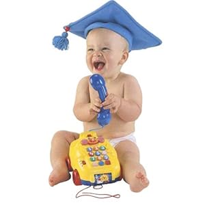 Product Description : Baby will have lots to talk about with this friendly phone and its "magically" moving mouth. Just picking up the receiver gets the conversation rolling, with numbers, counting, shapes and greetings. Pressing the number buttons helps baby learn counting and colors; pressing the shape buttons teaches triangle, circle and square. Spinning the roller starts two delightful tunes while the light-up nose blinks along. And the pull cord lets baby take the "mobile" phone for a walk. Requires 4 "AA" alkaline batteries (included).